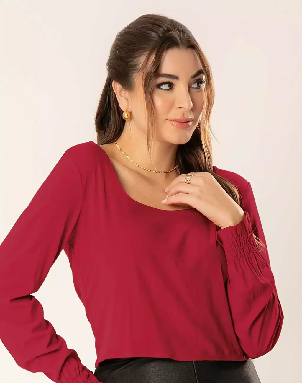 Elegante e moderna, a blusa vinho é perfeita para quem busca estilo com um toque de sofisticação. O modelo conta com decote arredondado e mangas longas com punho em lastex, que trazem leve volume e valorizam o visual.