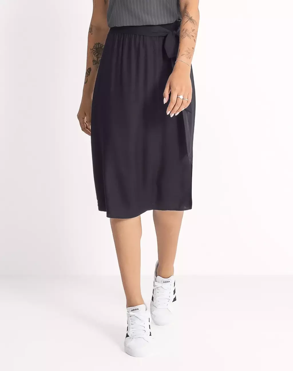 A saia midi em viscose é a combinação perfeita de conforto e estilo. Seu caimento fluido e leve proporciona liberdade de movimento, enquanto a faixa na cintura adiciona um toque de elegância e definição. A abertura na lateral dá um charme extra e traz um ar moderno à peça, tornando-a ideal tanto para looks casuais quanto mais sofisticados. Versátil e cheia de estilo, é uma escolha certeira para quem busca sofisticação e conforto em um só item.