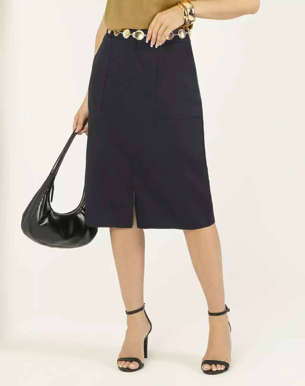 A Saia Midi com sua modelagem reta, estruturada com um corte central que favorece o caimento alongado e elegante da silhueta é ideal para composições versáteis e marcantes. Seu tecido em Viscose garante sofisticação e conforto no uso. O cós com passantes e fechamento por zíper e botão oculto valoriza o acabamento limpo e refinado da peça, mantendo um visual alinhado ao longo do dia com autenticidade e imponência nos detalhes.