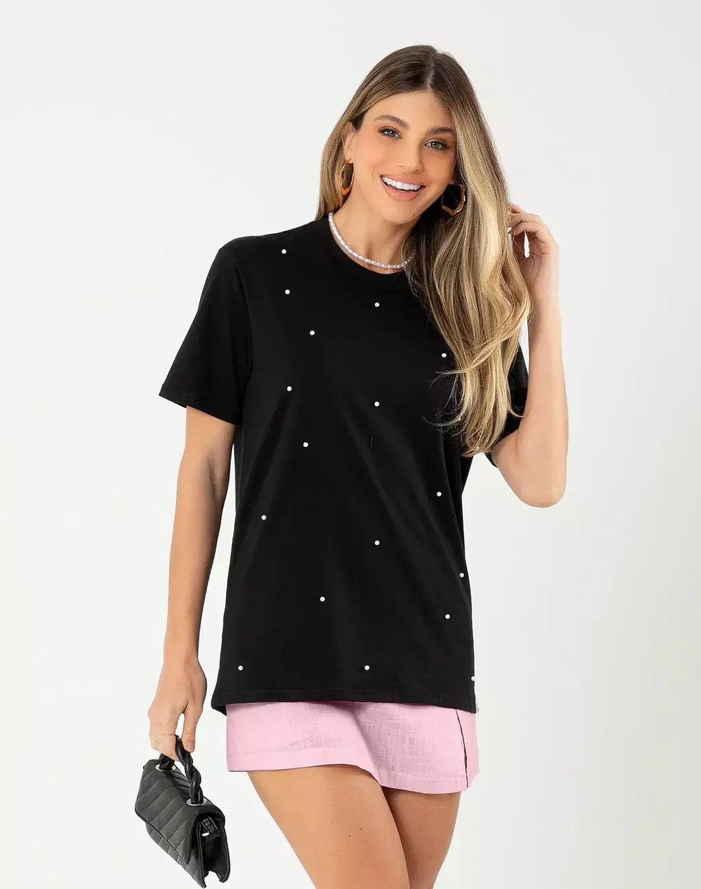 Eleve o básico a um novo patamar com a nossa T-Shirt Preta Bordada com Pérolas. Uma peça que combina o conforto do algodão com um toque de brilho e feminilidade.
